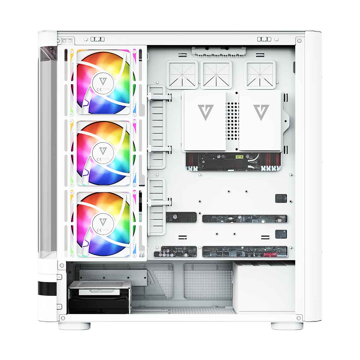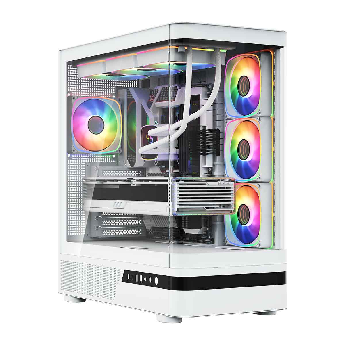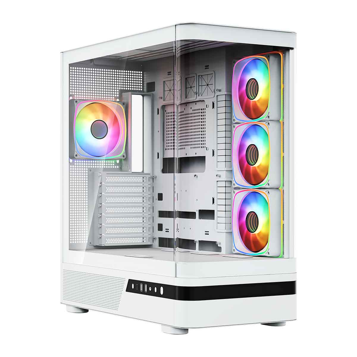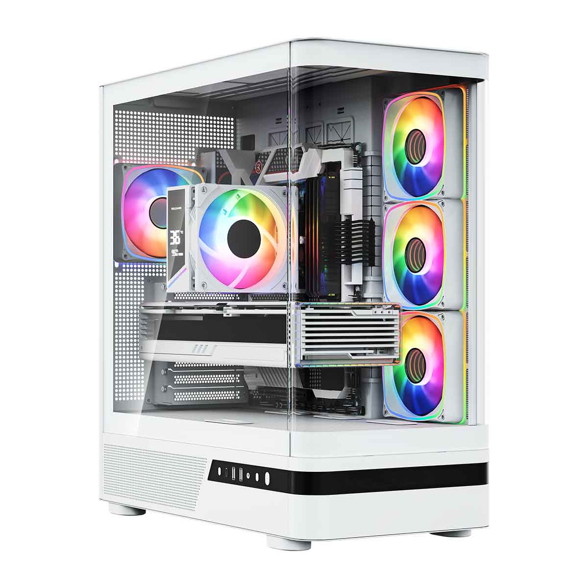 MODECOM Volcano AQ100 ma fabrycznie zainstalowane cztery wentylatory 120 mm ARGB. Trzy boczne wentylatory 120 mm ARGB typu reversed z odwróconymi łopatkami wtłaczają niezbędny chłód do środka, skutecznie schładzając komponenty. Natomiast czwarty wentylator 120 mm ARGB zamontowany z tyłu wyciąga gorące powietrze na zewnątrz. To optymalne rozwiązanie w zakresie chłodzenia komputera, które zapewnia świetną kulturę jego pracy oraz niskie temperatury. Obudowa posiada kontroler wentylatorów ARGB, za pomocą którego możesz sterować podświetleniem z pełnej palety barw kolorów RGB. Kontroler obsłuży do 6 wentylatorów. A jeśli nie jesteś fanem „świecidełek”, wystarczy po prostu wyłączyć podświetlenie dedykowanym przyciskiem na panelu sterowania.