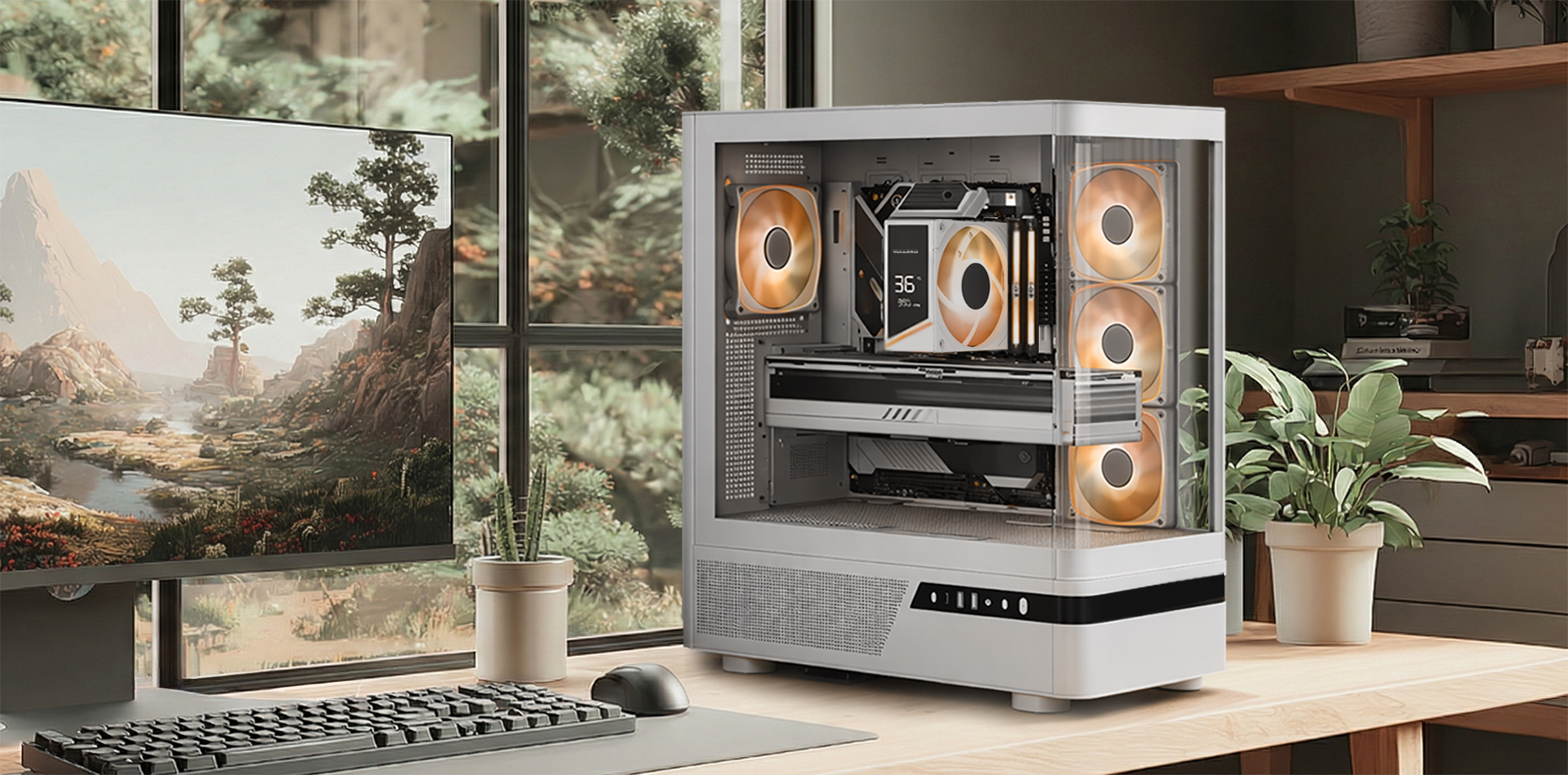 MODECOM Volcano AQ100 ARGB MIDI jest przedstawicielem serii obudów Volcano AQ charakteryzujących się efektownym wzornictwem obłych kształtów frontowego panelu z hartowanego szkła, możliwością montażu płyt głównych z odwróconymi złączami, czterema wentylatorami 120 mm ARGB w standardzie z kontrolerem podświetlenia ARGB i wsparciem dla chłodnic wodnych do 420 mm oraz licznymi perforacjami na panelach w celu zapewnienia chłodnej pracy komputera. Całość zalet uzupełniają dwa porty USB 3.0 oraz jeden USB-C (USB 3.2 Gen 2) na panelu bocznym. To obudowa stworzona, by cieszyć się widokiem zainstalowanych podzespołów.