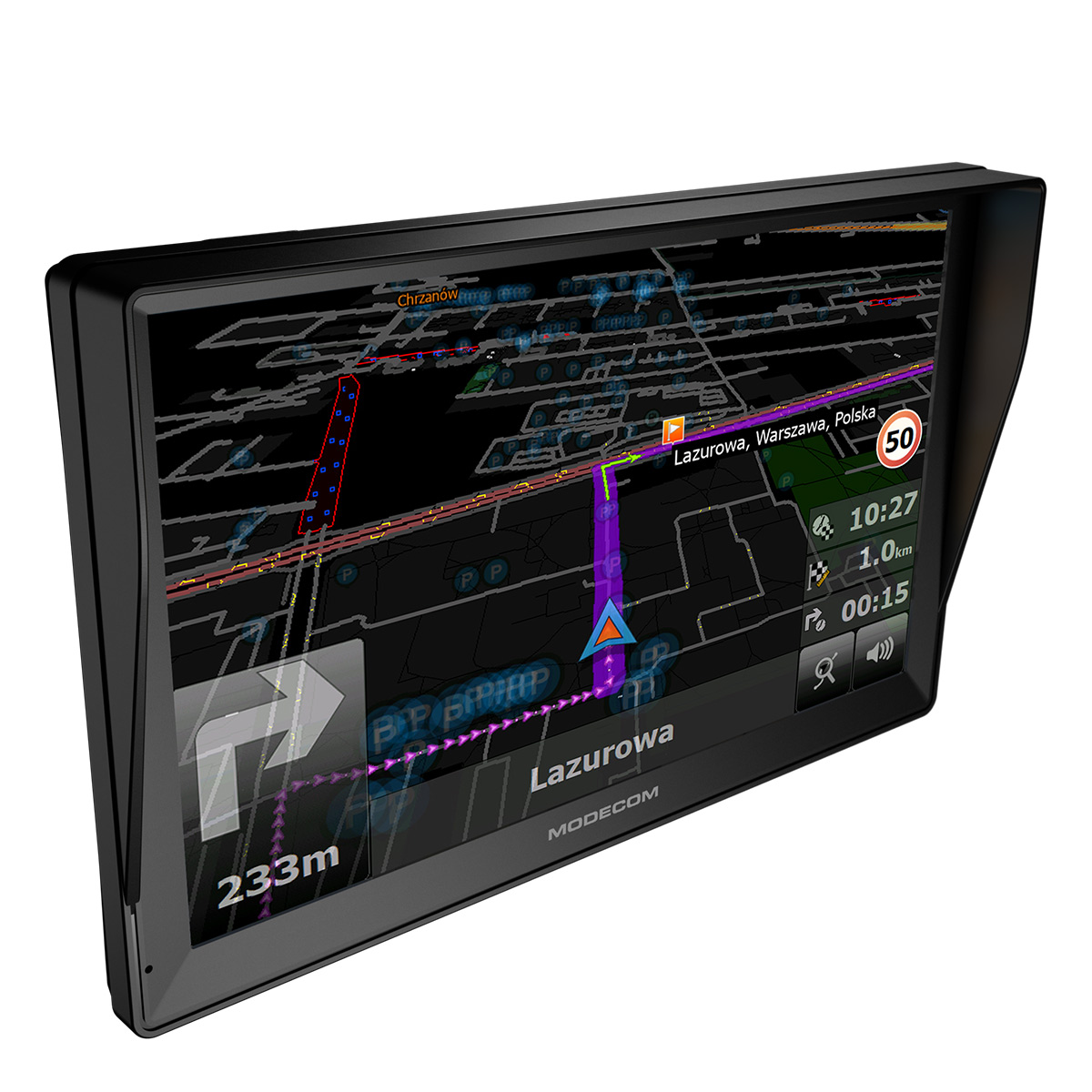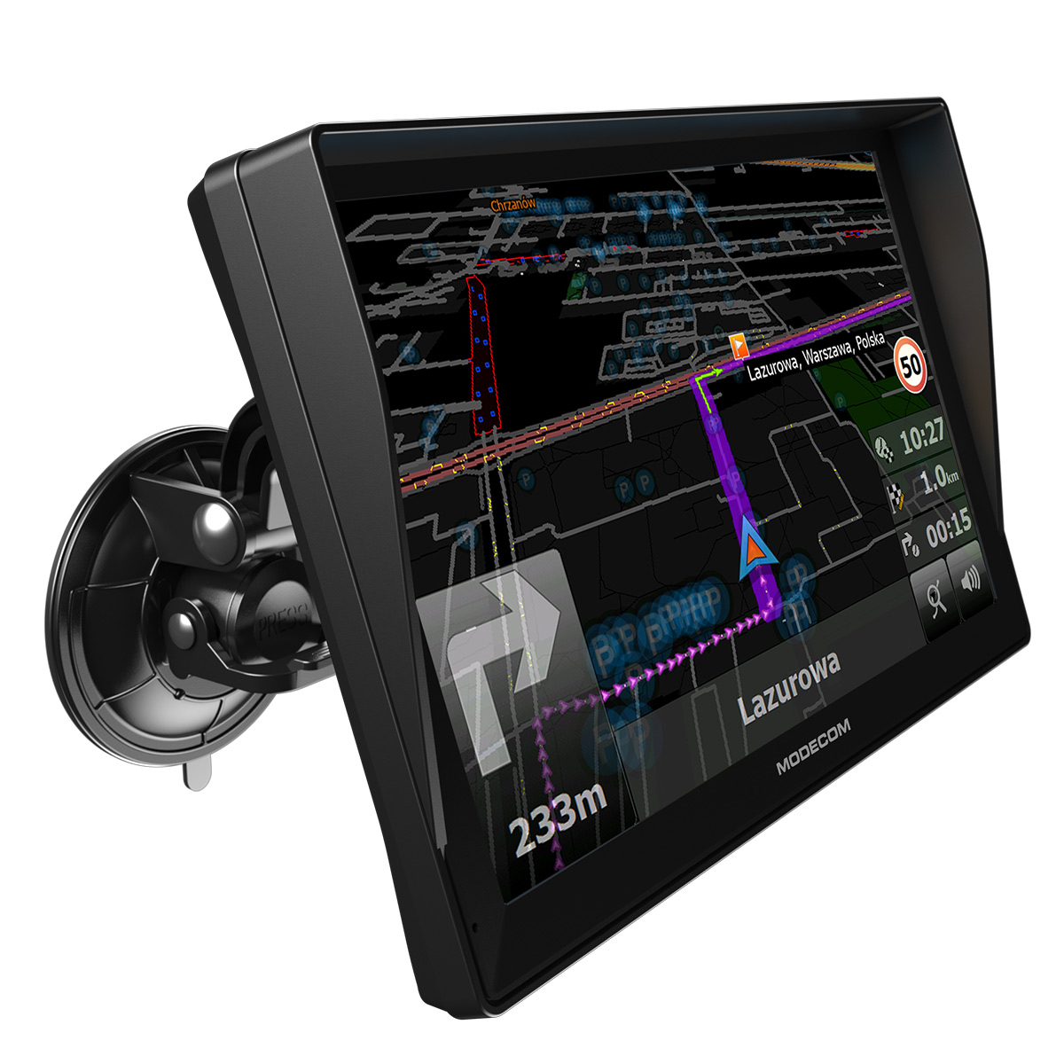 Nawigacja sprawdza się świetnie przede wszystkim w samochodach dostawczych, minivanach, truckach etc. Duży ekran pozwala dokładnie śledzić wytyczaną trasę nawet w słoneczny dzień. Osłona przeciwsłoneczna zapewnia dodatkową ochronę przed oślepiającym światłem słonecznym.