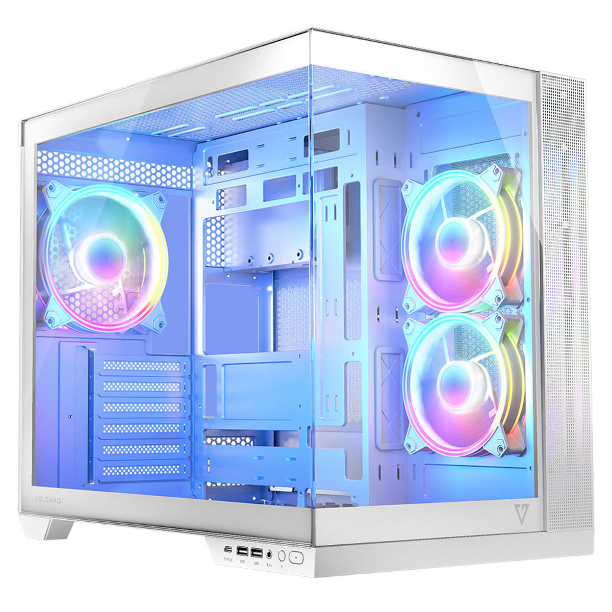 Często jest tak, że wybierając obudowę trzeba iść na kompromis – albo będzie ładna, albo będzie przewiewna. W Volcano Panorama nie planujemy kompromisów. Dlatego w parze z nowoczesnym wzornictwem idzie również dobra wentylacja. Przewiewny panel górny, wentylowana część na panelu od strony serwisowej i od spodu, przy odpowiednim układzie wentylatorów pozwala na chłodną pracę całego komputera, nawet podczas intensywnych i długich godzin grania.