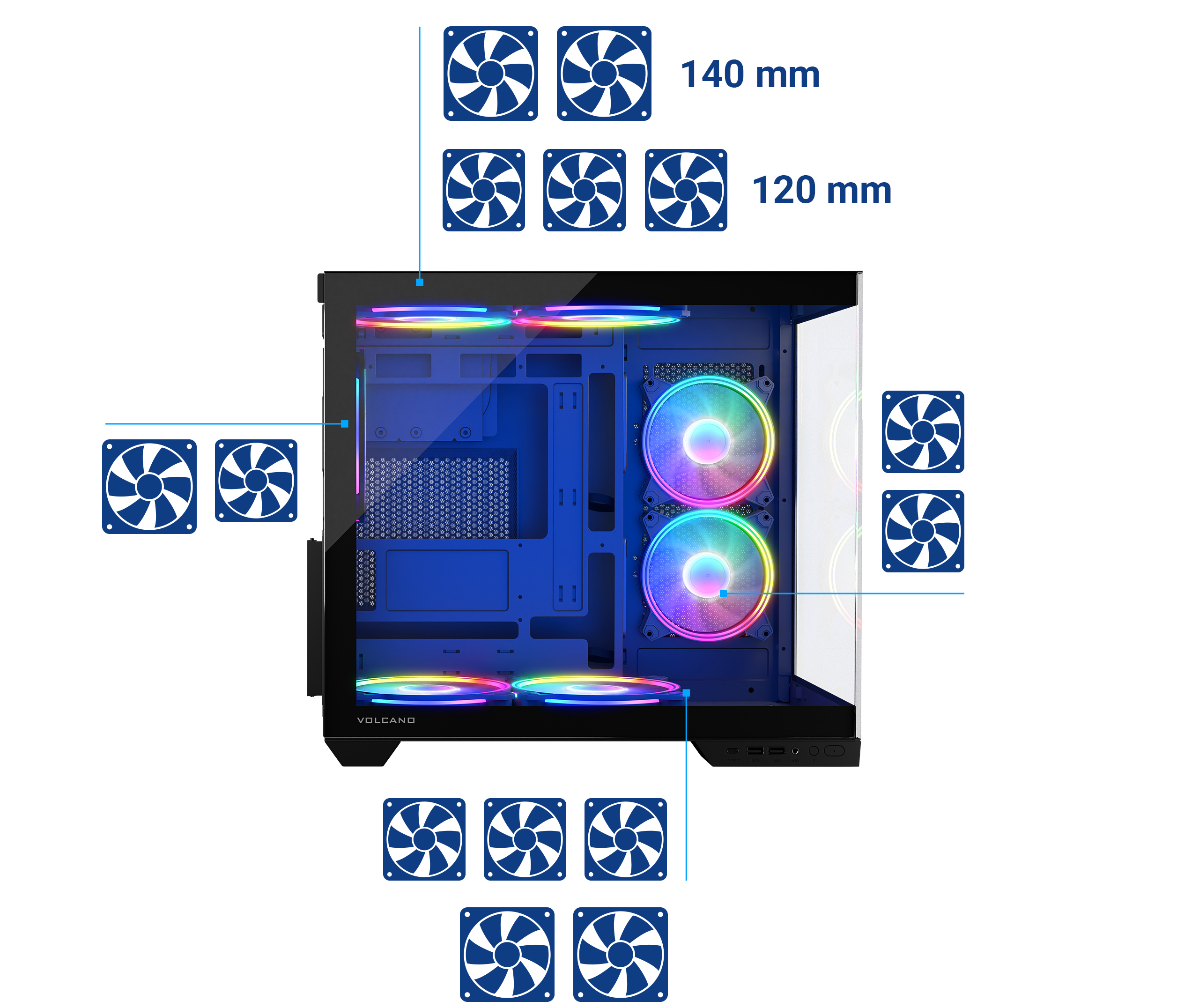 Przygotowaliśmy kilka wersji modelu. W zależności od wersji w standardzie otrzymujesz siedem, pięć lub trzy wentylatory ARGB. Wersja NF jest bez wentylatorów. Kontroler wentylatorów w standardzie. Volcano Panorama Midi NF (bez wentylatorów) Volcano Panorama Apex ARGB 3F Midi (trzy fabrycznie zamontowane wentylatory, z czego dwa z odwróconymi łopatkami) Volcano Panorama Apex ARGB 5F Midi (pięć fabrycznie zamontowanych wentylatorów, z czego cztery z odwróconymi łopatkami) Volcano Panorama Apex ARGB 7F Midi (siedem fabrycznie zamontowanych wentylatorów, z czego cztery z odwróconymi łopatkami)