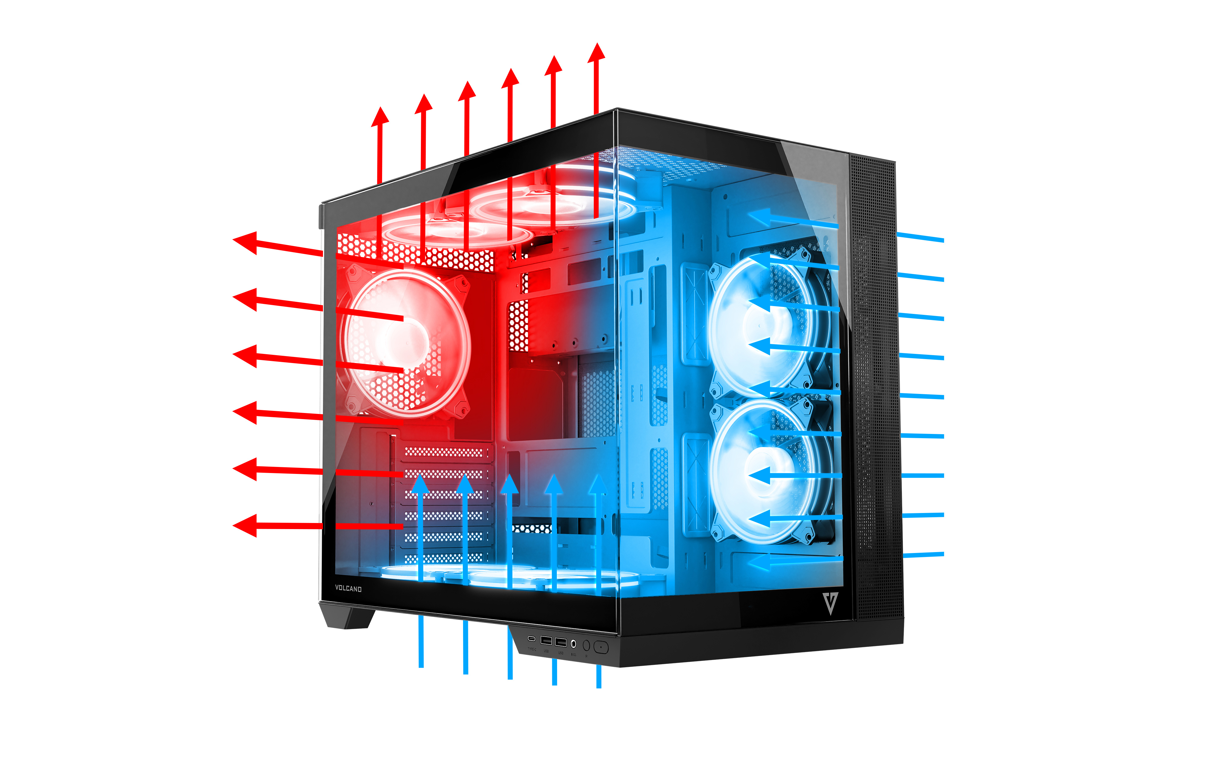 Często jest tak, że wybierając obudowę trzeba iść na kompromis – albo będzie ładna, albo będzie przewiewna. W Volcano Panorama nie planujemy kompromisów. Dlatego w parze z nowoczesnym wzornictwem idzie również dobra wentylacja. Przewiewny panel górny, wentylowana część na panelu od strony serwisowej i od spodu, przy odpowiednim układzie wentylatorów pozwala na chłodną pracę całego komputera, nawet podczas intensywnych i długich godzin grania.