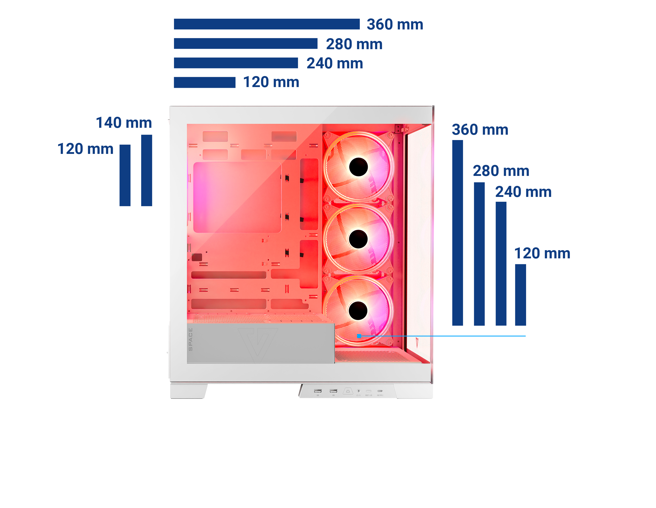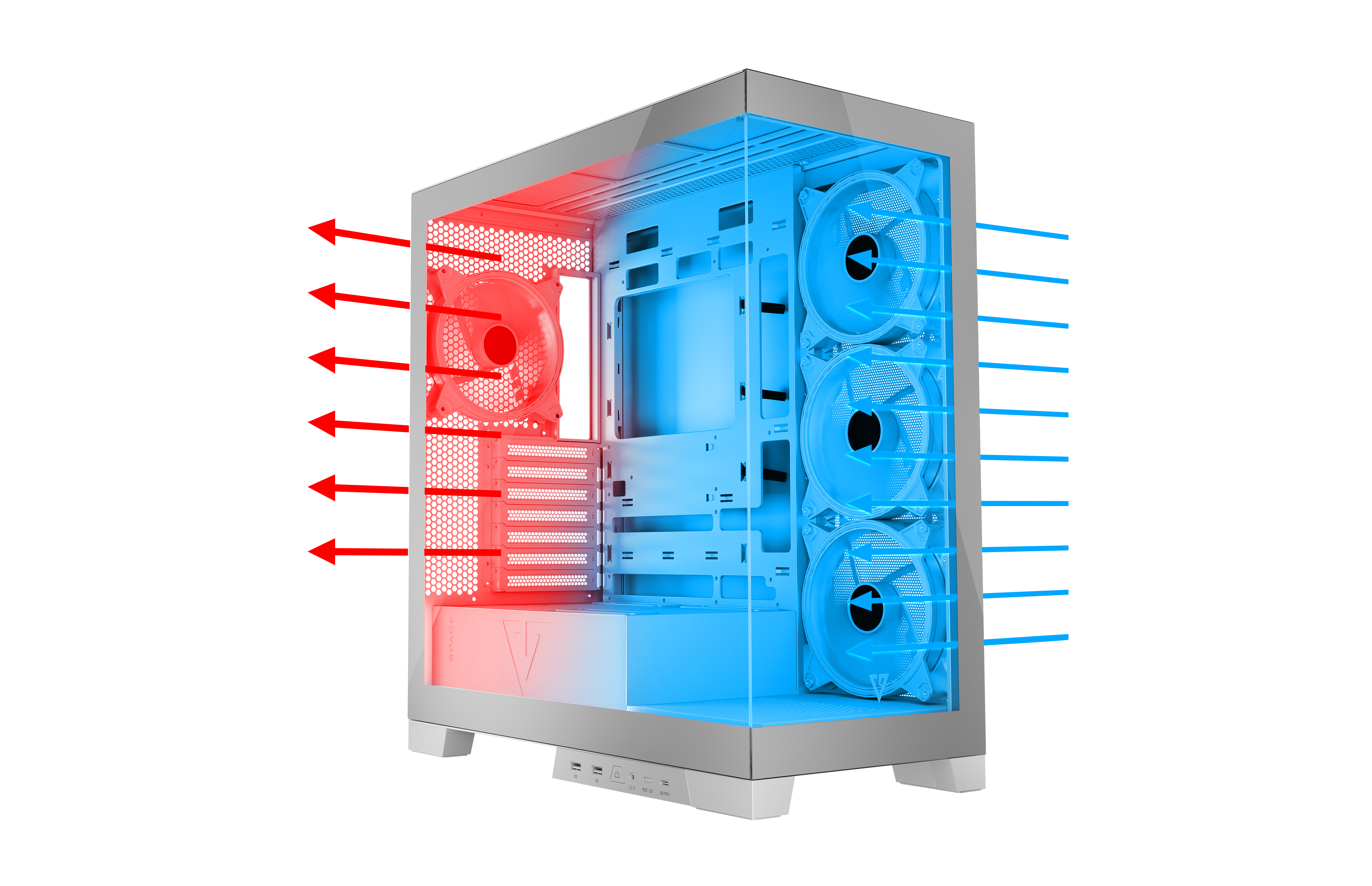 Chłodna praca komponentów jest najważniejsza. Dzięki temu pracują one efektywniej oraz zwiększa się ich żywotność. Fabrycznie zainstalowane wentylatory ARGB (3 x 140 mm na panelu bocznym oraz 1 x 140 mm z tyłu) zapewniają dobry przebieg powietrza skutecznie chłodząc pracę karty graficznej i procesora.