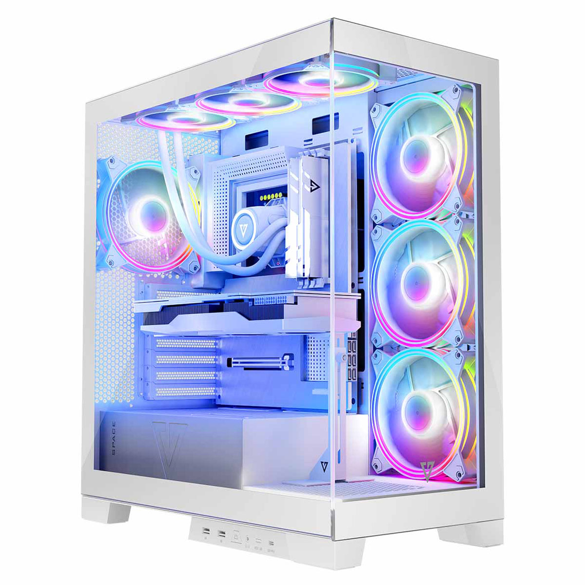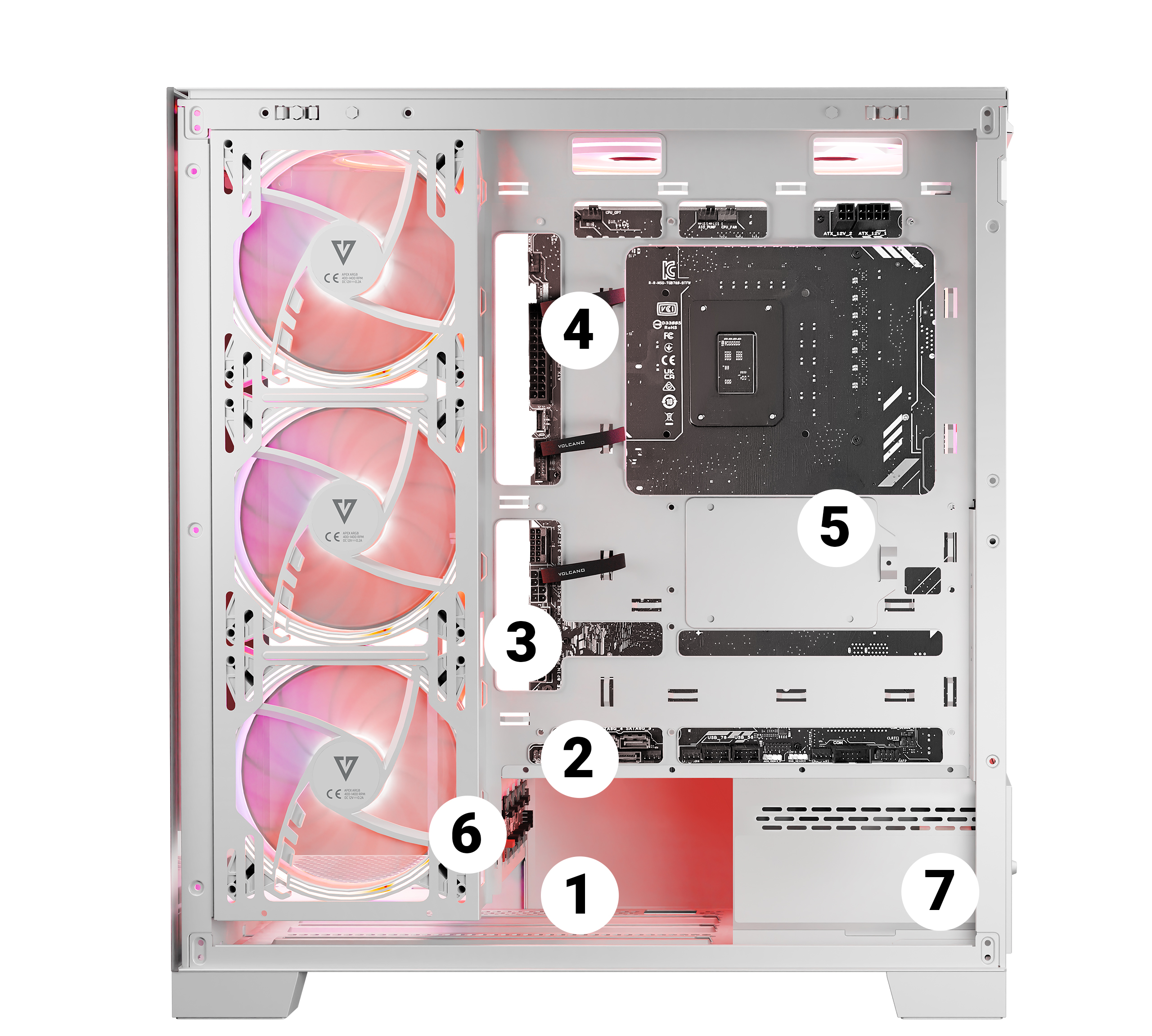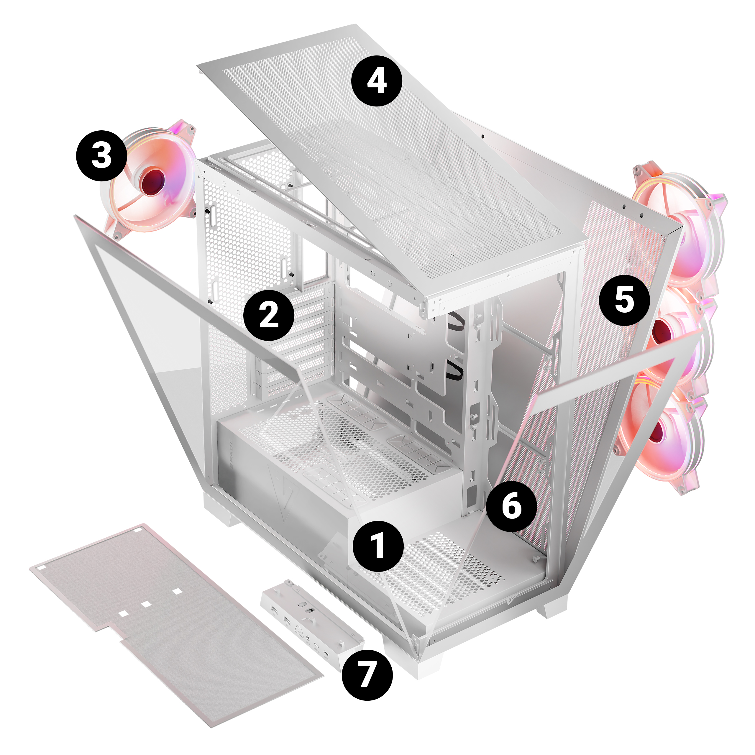 Podpórka pod GPU w zestawie. Możliwość zamontowania wentylatora we własnym zakresie w celu poprawy obiegu powietrza. Możliwość odwrócenia ramki slotów PCIe do pionowego montażu GPU. Jeden 140 mm fabrycznie zainstalowany wentylator ARGB. Przewiewny panel górny dla jak najlepszej cyrkulacji powietrza. Przystosowany do montażu chłodzenia wodnego. Trzy 140 mm fabrycznie zainstalowane wentylatory ARGB. Szklany panel frontowy i boczny dla jak najlepszego wyeksponowania komponentów. Panel I/O z portami USB z możliwością przeniesienia na front.